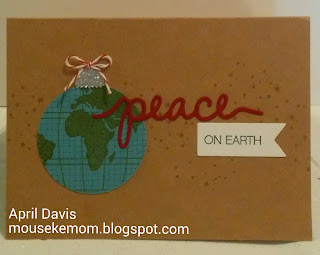 The card base is kraft, with layers of Marina Mist, Cherry Cobbler and Whisper White.  I stamped the base is Crumb Cake with the stars stamp from Holly Jolly Greetings.  I stamped the globe from Going Global in Old Olive on Marina Mist, then punched with my 2 inch circle punch.  The ornament bobble on top of the globe is punched in silver glitter using a mini cupcake wrapper from EK Success turned upside down.  I added a Cherry Cobbler baker's twine bow, using a micro glue dot.  I used the coordinating Holly Jolly dies to cut Peace in Cherry Cobbler, and the smallest banner die to make the flags.  On Earth is stamped in Night of Navy.  Inside, I used a sentiment from the SU Simply Snowflake set from My Paper Pumpkin.  Thanks for looking!  April